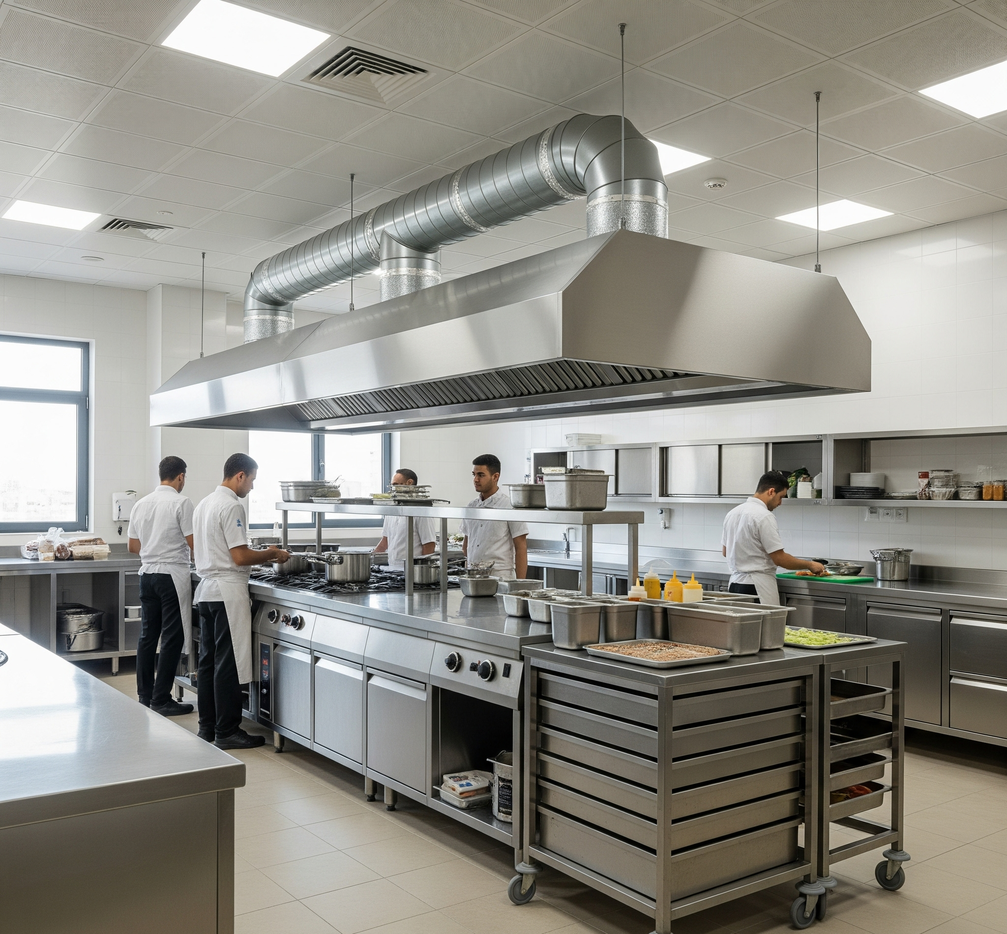 تصنيع أسطح العمل، الأحواض، والشفاطات (الهود) من الاستانلس ستيل الغذائي.